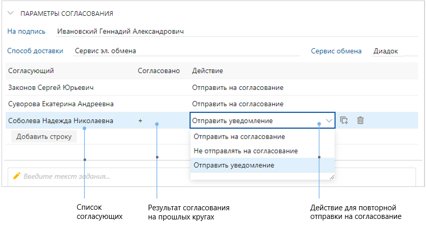 Можно добавлять дополнительных согласующих и изменять действия для отправки заданий на согласование |