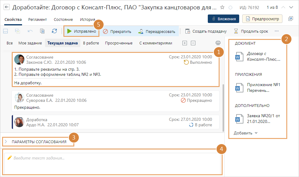 1.Откройте карточку задания на доработку документа и ознакомьтесь с замечаниями в переписке.