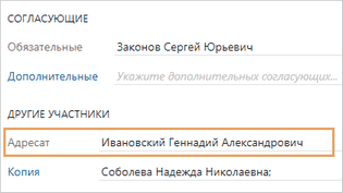 Сотрудник, которому придет документ на рассмотрение. Указан в карточке задачи на согласование по регламенту в поле *Адресат |