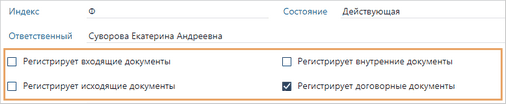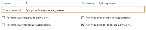 Ответственный за группу регистрации документов. Если документ зарегистрирован, то вычисляется следующим образом: 1.Определяется журнал регистрации, в котором зарегистрирован документ. Он указан в карточке документа в поле Журнал регистрации. 2.Определяется группа регистрации, участники которой имеют права на регистрацию документов в журнале. Она указана в карточке журнала регистрации в поле Группа регистрации. 3.Определяется ответственный за группу регистрации, который указан в карточке группы регистрации в поле *Ответственный: