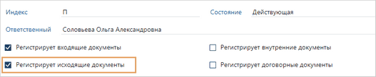 Ответственный за группу регистрации документов исходящего документопотока. Вычисляется следующим образом: 1.Если заданы настройки регистрации, то определяется журнал, в котором регистрируются исходящие документы. По журналу определяется группа регистрации, а по группе – ответственный за группу регистрации. 2.Если настройки регистрации не заданы, то сначала определяется подразделение, к которому относится документ. Оно указано в карточке документа в поле *Подразделение. Затем определяются группы регистрации, которые регистрируют документы данного подразделения. Оно указано в карточке группы регистрации в поле Подразделения. Из числа найденных групп регистрации определяется группа, которая регистрирует документы исходящего документопотока. Данная возможность определяется флажком Регистрирует исходящие документы в карточке группы регистрации: