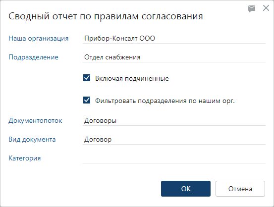 Наша организация и Подразделение, по данным которых формируется отчет. Установите флажок Включая подчиненные, чтобы в отчет попадали правила согласования для подчиненных организаций и подразделений. В результате: •если указана наша организация, в отчете отображаются правила для нашей организации и ее подчиненных организаций; •если указано подразделение, в отчете отображаются правила для него и подчиненных подразделений. Если флажок Включая подчиненные не установлен, в отчете отображаются правила согласования только для выбранной организации и подразделения. По умолчанию флажок установлен. Если наша организация и подразделение не указаны, в отчете отображаются правила для всех существующих организаций и подразделений. Установите флажок Фильтровать подразделения по нашим орг., чтобы в отчете отображались правила согласования только для подразделений, которые фактически относятся к нашей организации. В поле Подразделение для выбора станут доступны только подразделения выбранной организации. Например, отдел продаж может оформлять договоры от имени нескольких наших организаций, но по оргструктуре входить только в одну. В этом случае, отчет отобразит правила согласования только для нашей организации, в которую входит это подразделение. Если наша организация не указана, флажок Фильтровать подразделения по нашим орг. устанавливать не нужно. По умолчанию флажок установлен. Документопоток, Вид документа и Категория договора, для которых должны быть настроены правила согласования. В поле Вид документа можно выбрать только тот вид, в карточке которого в поле Действия по отправке указано значение Согласование по регламенту. СОВЕТ. Чтобы сформировать отчет по всем правилам согласования, оставьте поля пустыми. |