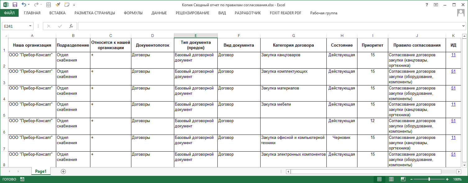 Для поиска правил согласования также используются дополнительные критерии: •Относится к нашей организации. Позволяет найти правила согласования для подразделений, которые фактически относятся к выбранной организации. Например, одно подразделение может формировать и согласовывать документы от имени нескольких наших организаций, но фактически входить только в одну. Чтобы найти правила согласования для выбранной нашей организации, отфильтруйте записи по значению +. Критерий используется, если при формировании отчета был снят флажок Фильтровать подразделения по нашим орг.; •Тип документа (предок). Базовый документ системы, от которого в системе созданы другие документы. Базовый документ недоступен для просмотра. Возможные значения: «Базовый договорной документ», «Внутренний документ», «Исходящий документ» и «Финансовый документ». Например, от финансового документа созданы все акты, накладные, УПД и пр. Фильтрация по типу документа используется, когда разреза по документопотоку недостаточно. Например, чтобы найти правила согласования для финансово-хозяйственных документов, недостаточно отфильтровать данные только по документопотоку Договор. В отчет не попадут входящие счета на оплату, так как они относятся к документопотоку Входящие. В этом случае нужно очистить фильтр в колонке «Документопоток» и в колонке «Тип документа (предок)» установить фильтр Финансовый документ; •Правило согласования со значением «Используется правило согласования договора». Позволяет найти дополнительные соглашения, которые согласуются по правилам согласования договоров. Для дополнительных соглашений в системе не настроены правила согласования. При отправке документа на согласование для выбора доступно правило согласования договора, к которому относится дополнительное соглашение. В отчете для таких документов в колонке «Правило согласования» отображается значение Используется правило согласования договора. Чтобы найти нужное правило согласования, отфильтруйте данные по виду договора, который указан в карточке дополнительного соглашения. |
