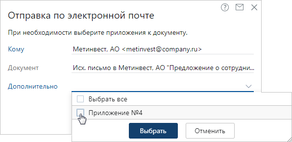 По умолчанию из задания в электронное письмо вкладывается последняя версия основного документа. Если у документа есть адресаты с электронной почтой или приложения, указанные на закладке «Связи» в группах «Приложения» или «Прочие», то откроется окно: В окне выберите адресатов и список приложений, которые необходимо отправить вместе с основным документом. Подробное описание полей см. в разделе «Отправка вложением в письмо». ПРИМЕЧАНИЕ. В списке отображаются только документы с содержимым. По умолчанию вложением в письмо отправляются последние версии выбранных документов. |