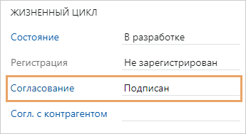 В карточке документа в группе полей «Жизненный цикл» в поле Согласование устанавливается значение Подписан: