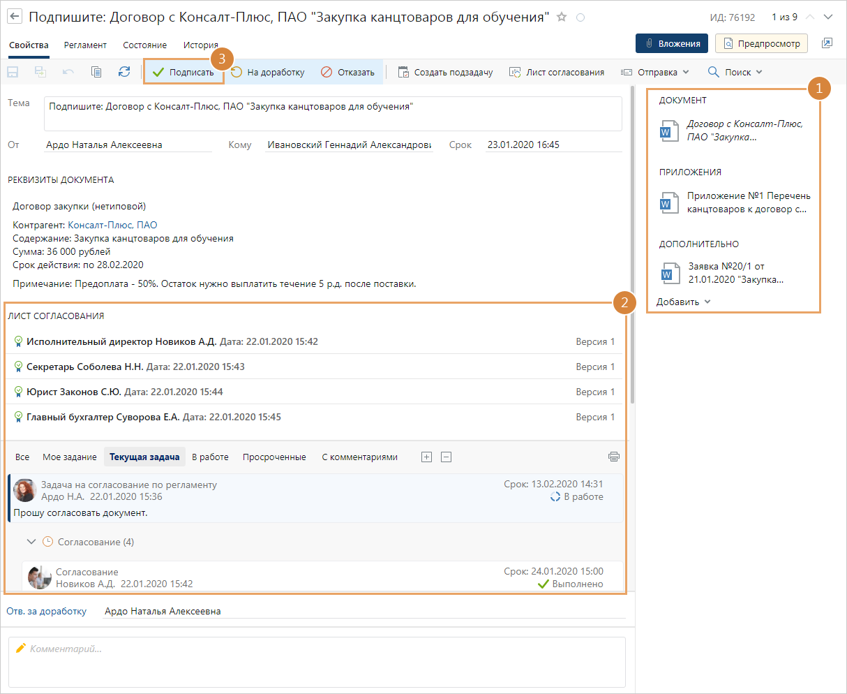 1.Откройте карточку задания на подписание и ознакомьтесь с документом, приложениями и дополнительными документами из области вложений. Изучите инструкцию к заданию, если она есть.