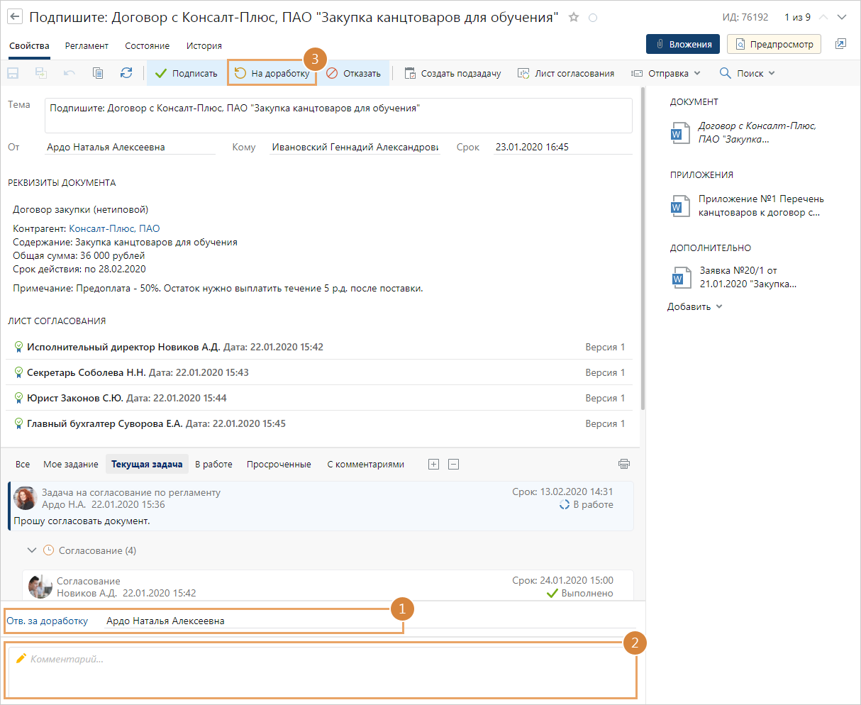 1.В карточке задания в поле Отв. за доработку укажите сотрудника, которому нужно отправить документы на доработку. В списке для выбора доступны все сотрудники, принимающие участие в задаче на согласование по регламенту.