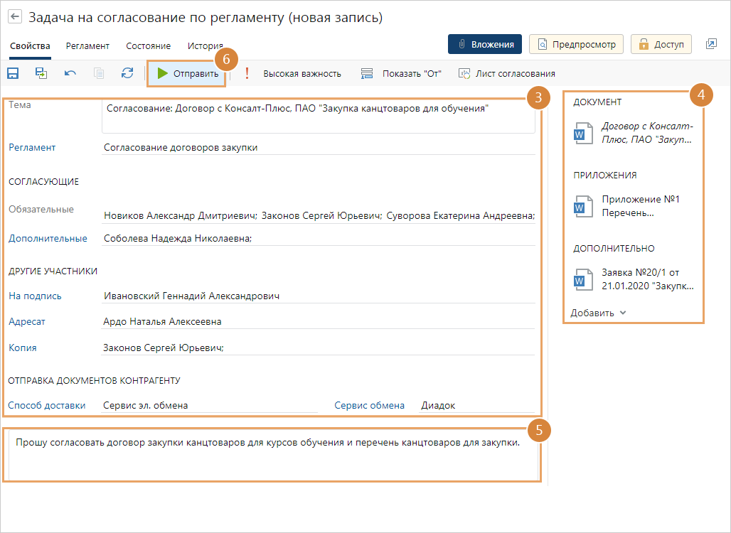 Дополнительные. Список сотрудников, которые не включены в список обязательных согласующих, но им необходимо участвовать в согласовании документа. Например, если необходимо согласовать документ с заинтересованными сотрудниками смежных отделов. Помимо сотрудников можно также указать роли, группы, подразделения или организации. Для заполнения используйте like-ввод. Важно. Поле Дополнительные отображается, если в правиле есть этап с типом «Согласование», в котором установлен флажок Инициатор согласования может указывать дополнительных согласующих. *На подпись. Сотрудник, которому после согласования документ придет на подписание. По умолчанию автоматически заполняется сотрудником, который указан в карточке документа в поле Подписал. Если в карточке подписывающий не заполнен, то указывается сотрудник, у которого есть право подписи данного документа с наибольшим приоритетом. Если у нескольких сотрудников есть право подписи с одинаковым приоритетом, то поле не заполняется. В этом случае укажите нужного сотрудника вручную. *Адресат или *Адресаты. Один или несколько сотрудников соответственно, которым документ придет на рассмотрение. Например, руководитель. Если на согласование отправляется документ с типом «Служебная записка», то поле доступно только для просмотра и автоматически заполняется именем сотрудника, указанным в карточке документа в поле *Адресат. Если на согласование отправляется многоадресная служебная записка, название поля меняется на *Адресаты и заполняется автоматически именами сотрудников, указанными в карточке документа на закладке «Адресаты». Если отправляется любой другой документ, то поле по умолчанию не заполнено. В этом случае укажите нужного сотрудника самостоятельно. Важно. Поля *На подпись, *Адресат или *Адресаты отображаются, если в правиле есть: •этапы типа «Подписание», «Рассмотрение адресатом» или «Рассмотрение несколькими адресатами» соответственно; •условия «Исполнители ролей согласования совпадают», «Исполнитель роли согласования совпадает с сотрудником», «Сотрудник входит в роль согласования», «Несколько адресатов» в которых используются роли согласования Подписывающий, Помощник подписывающего, Адресат, Адресаты, Помощник адресата, Ответственный за печать. Копия. Список сотрудников, которые заинтересованы в ходе согласования документа. Помимо конкретных сотрудников можно также указать роли, группы, подразделения или организации и при необходимости скорректировать список. После старта задачи им будет отправлено уведомление. Способ доставки документа контрагенту. Возможные значения выбираются из справочника Способы доставки. Поле отображается, если в правиле согласования есть этап с типом «Отправка контрагенту» или условие согласования с типом «Способ доставки документов». Если документ после подписания нужно отправить контрагенту через сервис обмена, в поле Способы доставки выберите значение «Сервис эл. обмена». В поле *Сервис обмена укажите название сервиса. Примечание. Значение «Сервис эл. обмена» можно указать, только если с контрагентом установлен обмен электронными документами через сервисы обмена. При этом если на согласование отправляется: •документ, полученный от контрагента через сервис обмена, то способ доставки «Сервис эл. обмена» и название серви