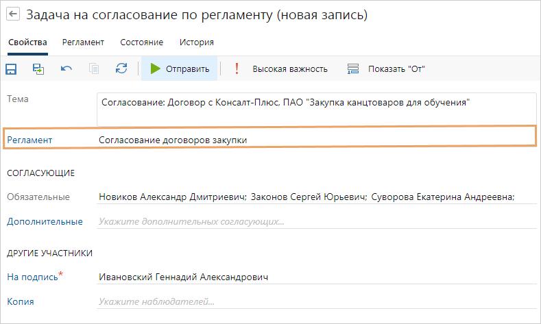 Примечание. Если поле Регламент не заполнилось автоматически, выберите нужное правило согласования вручную.