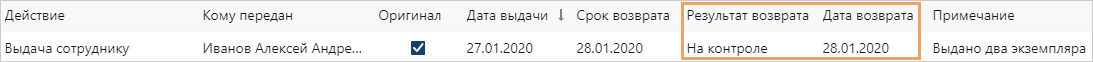 В журнале передачи оригиналов и копий документа в соответствующей строке поле Дата возврата заполнится текущей датой, а поле Результат возврата значением На контроле.
