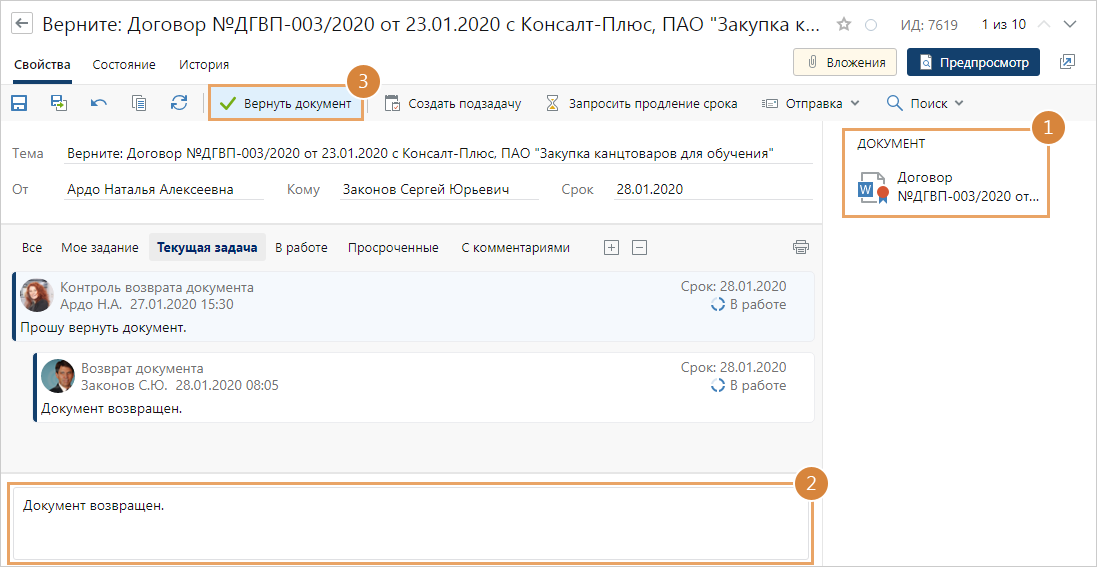 1.Откройте задание на возврат документа. Ознакомьтесь с электронным документом, оригинал или копию которого необходимо вернуть. Верните документ ответственному за хранение оригиналов документов.