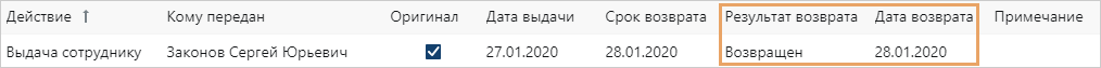 В журнале передачи оригиналов и копий документа в соответствующей строке поле Дата возврата заполнится текущей датой, а поле Результат возврата значением Возвращен.