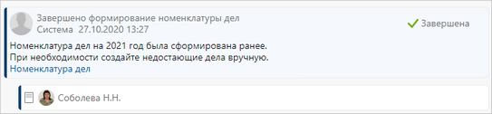 Примечание. Возможны ситуации, когда по указанным критериям нет записей для копирования или номенклатура дел на указанный год уже сформирована. Информация об этом указывается в уведомлении, например: