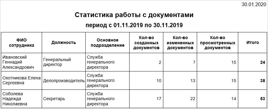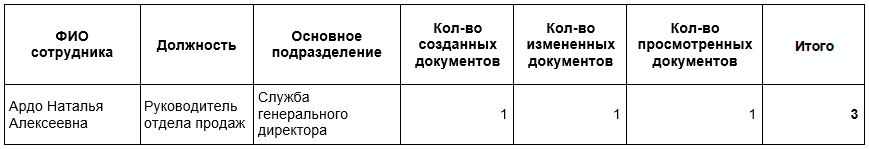 В отчете отображается список сотрудников, отсортированный в порядке возрастания количества обработанных сотрудниками документов. У каждого сотрудника можно посмотреть: •должность; •основное подразделение (указано в карточке сотрудника); •количество созданных документов; •количество документов, содержимое которых сотрудник изменял или просматривал; •общее количество обработанных документов (сумма всех созданных, измененных и просмотренных сотрудником документов). Примечание. Если сотрудник несколько раз изменял и просматривал один и тот же документ, то в отчете посчитается, что сотрудник изменял и просматривал по одному документу. Например, если сотрудник создал 1 документ, изменил его 2 раза и просматривал 3 раза, то в отчете будут отображаться значения: