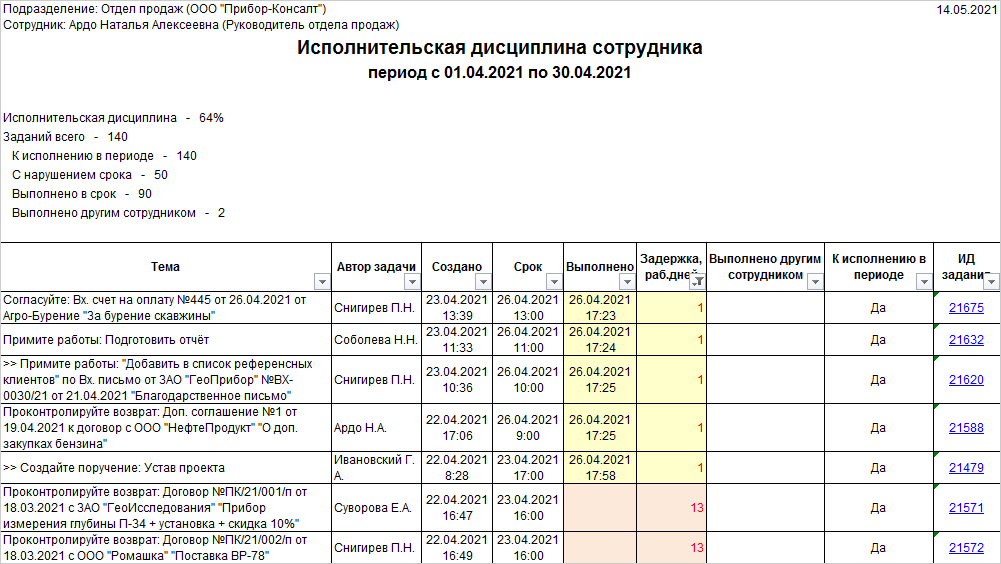 Отчет строится за выбранный период. До таблицы приводится процент исполнительской дисциплины и общая сводка по всем заданиям сотрудника. Исполнительская дисциплина. Процент заданий, выполненных сотрудником в срок. Считается по формуле, результат вычисления которой округляется до целого числа: