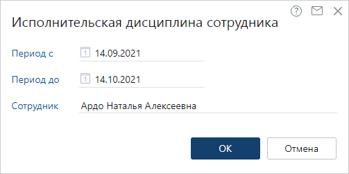 В апреле 2021 у Натальи Ардо понизился процент исполнительской дисциплины. Необходимо проверить, какие задания Наталья выполнила с задержкой и какие не выполнила. Для этого: 1.Запустите отчет «Исполнительская дисциплина сотрудника» и заполните параметры следующим образом:
