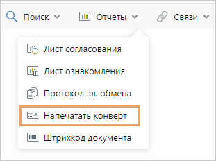 1.В карточке исходящего или договорного документа на панели действий в выпадающем списке Отчеты выберите пункт Напечатать конверт: