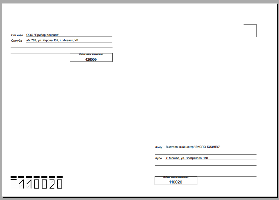 Примечание. Если конверт формируется для многоадресного исходящего письма, то для каждого адресата создается отдельный заполненный бланк.