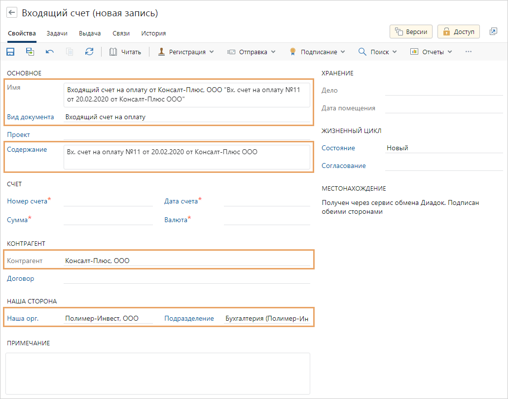 В поле Местонахождение появится запись о том, что документ получен из сервиса обмена.