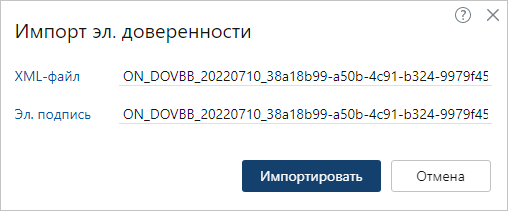 и выберите файлы: XML-файл доверенности и электронную подпись в формате SIG или SGN: