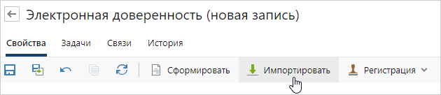 2.В карточке на панели действий нажмите на кнопку Импортировать доверенность: