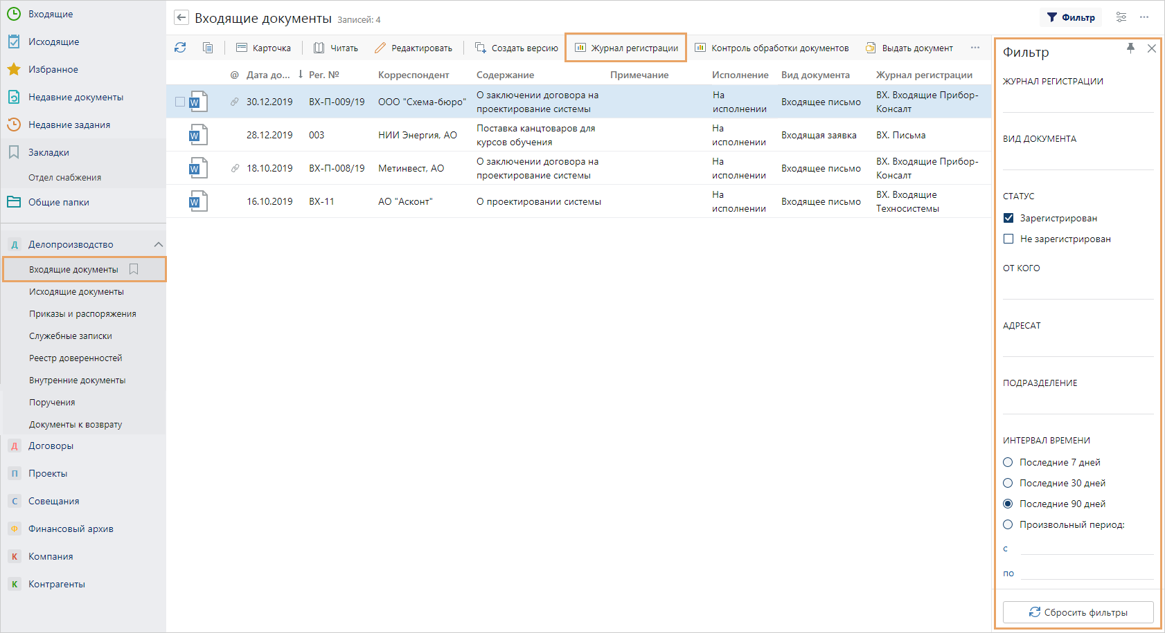 •поиска входящих документов по заданным параметрам с помощью панели фильтрации. Например, можно посмотреть список всех входящих документов, зарегистрированных в определенном журнале регистрации;