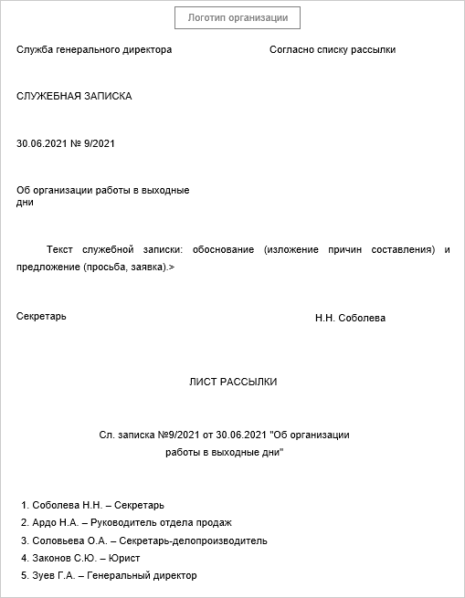 •«Шаблон служебной записки (несколько адресатов)» – рекомендуется использовать для создания многоадресной служебной записки. В документе указываются адресаты и их должности, создается лист рассылки, который находится на отдельной странице в конце документа. Если адресатов более четырех, в документе появляется надпись «Согласно списку рассылки». Список адресатов отображается в листе рассылки: