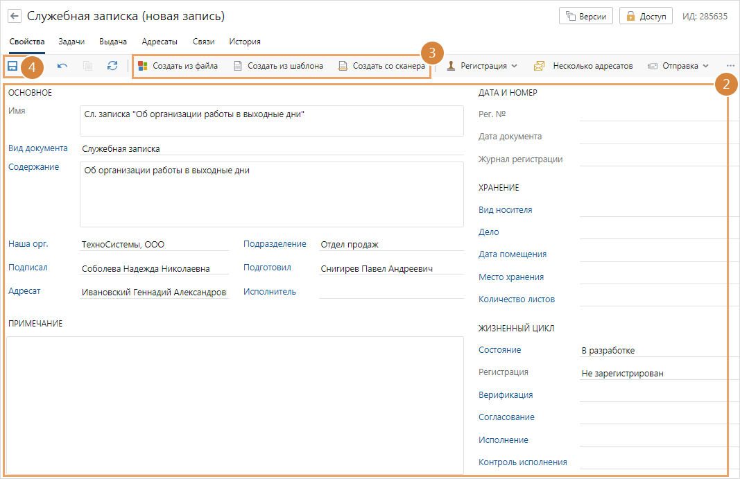 *Вид документа. Выбирается, если в системе настроены разные виды служебных записок, например, заявка на закупку, заявка на оплату, объяснительная. Список доступных для выбора видов документа определяется администратором системы. Для разных видов служебных записок может быть предусмотрен свой регламент обработки. В этом случае при отправке документа на согласование по регламенту в зависимости от вида автоматически определяется подходящее правило согласования. *Содержание. Краткое содержание документа. *Наша орг. Наша организация, в которой составляется служебная записка. *Подразделение, к которому относится документ. Примечание. Поля *Наша орг. и *Подразделение заполняются автоматически согласно персональным настройкам или настройкам системы. *Адресат. Руководитель или специалист, которому адресована служебная записка. Если служебную записку необходимо отправить на рассмотрение нескольким сотрудникам, на панели действий нажмите на «залипающую» кнопку Несколько адресатов. Затем на закладке «Адресаты» укажите нужных сотрудников. Поле *Адресат станет доступным только для просмотра и заполнится значением Несколько адресатов. Выбранные адресаты автоматически указываются в задаче на рассмотрение документа. *Подписал. Сотрудник, который подписал служебную записку. По умолчанию указывается сотрудник, который создает документ в системе. *Подготовил. Сотрудник, который подготовил служебную записку. По умолчанию указывается сотрудник, который создает документ в системе. Примечание. Подготовить и подписать служебную записку могут разные сотрудники. Если служебная записка создается из шаблона, то в ее содержимом в поле Отметка об исполнителе указывается сотрудник, который подготовил документ. Если служебную записку подготовил и подписал один сотрудник, то отметка об исполнителе в содержимом документа не указывается. Исполнитель работ по служебной записке. Заполняется автоматически из карточки поручения, если документ отправляется на исполнение. При необходимости изменить исполнителя в карточке служебной записки могут сотрудники, которые входят в группу регистрации внутренних документов. Вид носителя документа. Возможные значения выбираются из справочника «Вид носителя документа». Количество листов в бумажном экземпляре документа. Место хранения бумажного экземпляра документа, например, номер тома. Количество листов приложений к документу в бумажном виде. По умолчанию поле не отображается. При необходимости попросите аналитика добавить его на форму с помощью редактора форм. Примечание. Дополнительная информация по служебной записке. Рубрика и Подрубрика. Категория, к которой относится документ в соответствии с его содержанием. Список для выбора определяется администратором системы. Из карточки рубрики можно найти все документы по нужной тематике. По умолчанию поля не отображаются. При необходимости попросите аналитика добавить их на форму с помощью редактора форм. ИД внешней системы. Идентификатор документа во внешней системе, если для нее настроена интеграция с Directum RX. По умолчанию поле не отображается. При необходимости попросите аналитика добавить его на форму с помощью редактора форм. |