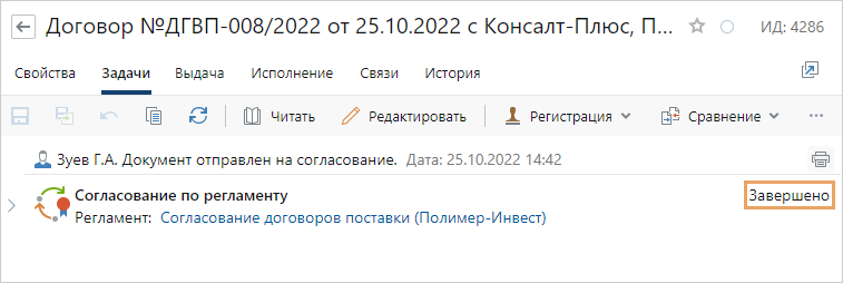 Примечание. В карточке приложения можно отслеживать состояние работ по документу, к которому оно относится. Для этого на закладке «Задачи» кроме задач, отправленных по приложению, отображаются задачи на согласование по регламенту, на свободное согласование и созданные по ним задания, в которые вложен основной документ для приложения.