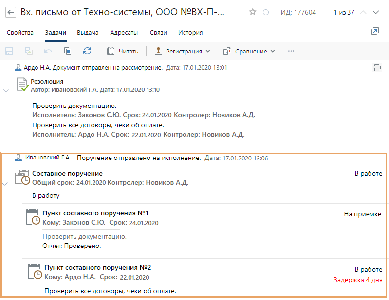 •посмотреть основные этапы работы с документом. Например, руководитель может посмотреть, как выполнялись поручения после рассмотрения документа;