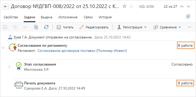 Для мониторинга состояния работ по документу используйте закладку «Задачи» в карточке документа. С помощью закладки можно: