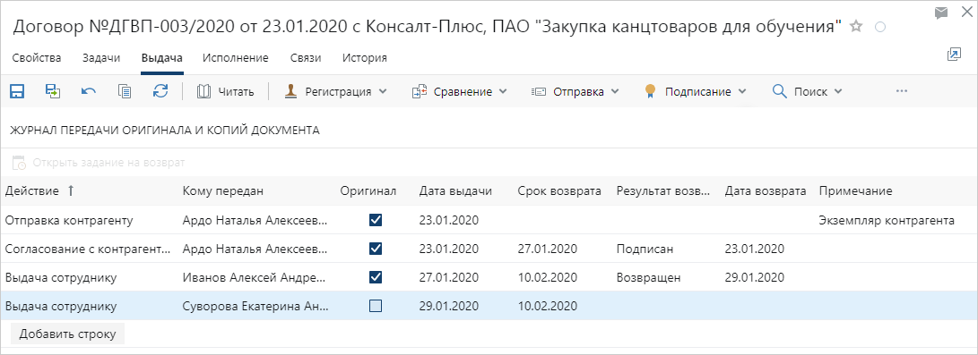 •фиксации того, что оригинал или копия бумажного документа выдана сотруднику и возвращена:
