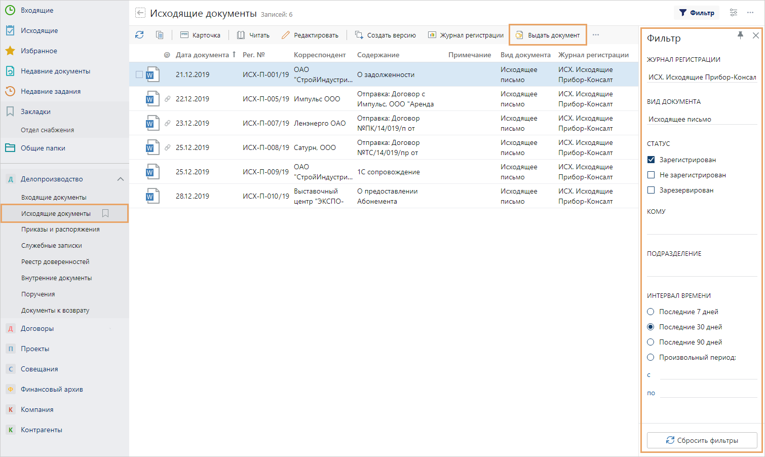 •поиска исходящих документов по заданным параметрам с помощью панели фильтрации. Например, можно посмотреть список всех исходящих документов, зарегистрированных в определенном журнале регистрации.