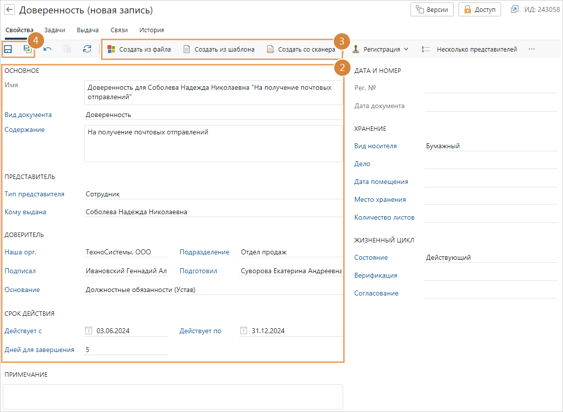 После создания документ попадает в список «Реестр доверенностей».