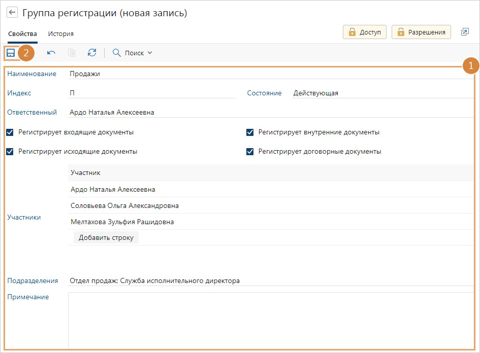 Участниками могут быть, например, делопроизводители. Ответственный за группу регистрации автоматически включается в список участников.