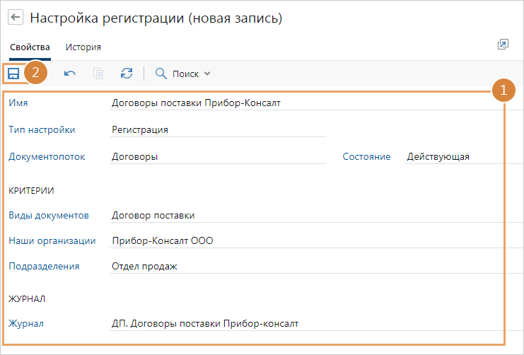 В настройках регистрации задаются критерии, по которым для документа автоматически подбирается журнал регистрации в соответствии с реквизитами документа. Журнал регистрации определяется при совершении сотрудником операций: регистрация, присвоение номера или резервирование номера для документа. Также настройки регистрации используются для вычисления ролей «Регистратор документа» и «Регистратор исходящей корреспонденции» при согласовании документа по регламенту.