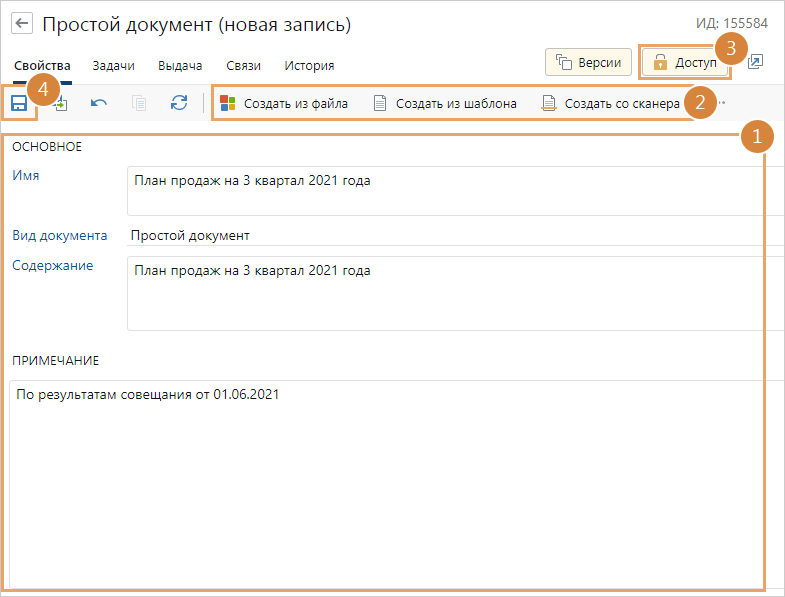 2.Добавьте содержимое документа с помощью кнопки Создать из файла, Создать из шаблона или Создать со сканера на панели действий.