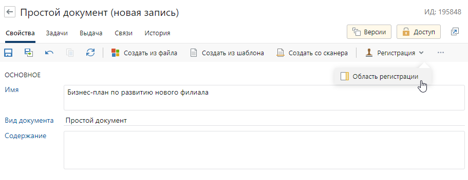 Чтобы посмотреть или изменить информацию о хранении бумажного экземпляра документа, на панели действий в выпадающем списке Регистрация выберите пункт Область регистрации: В результате на карточке в группе Хранение появятся поля: •Количество листов в бумажном экземпляре документа; •Количество листов приложений к документу в бумажном виде. По умолчанию поле не отображается. При необходимости попросите аналитика добавить его на форму с помощью редактора форм. Заполните поля, если в организации параллельно ведется бумажное делопроизводство. Остальные поля заполняются делопроизводителем. Подробнее см. раздел «Обработка входящего документа». При последующем открытии карточки поля скрываются. |