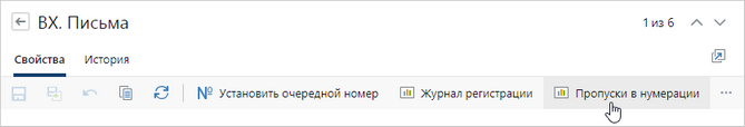1.Откройте карточку журнала регистрации и на панели действий нажмите на кнопку Пропуски в нумерации:
