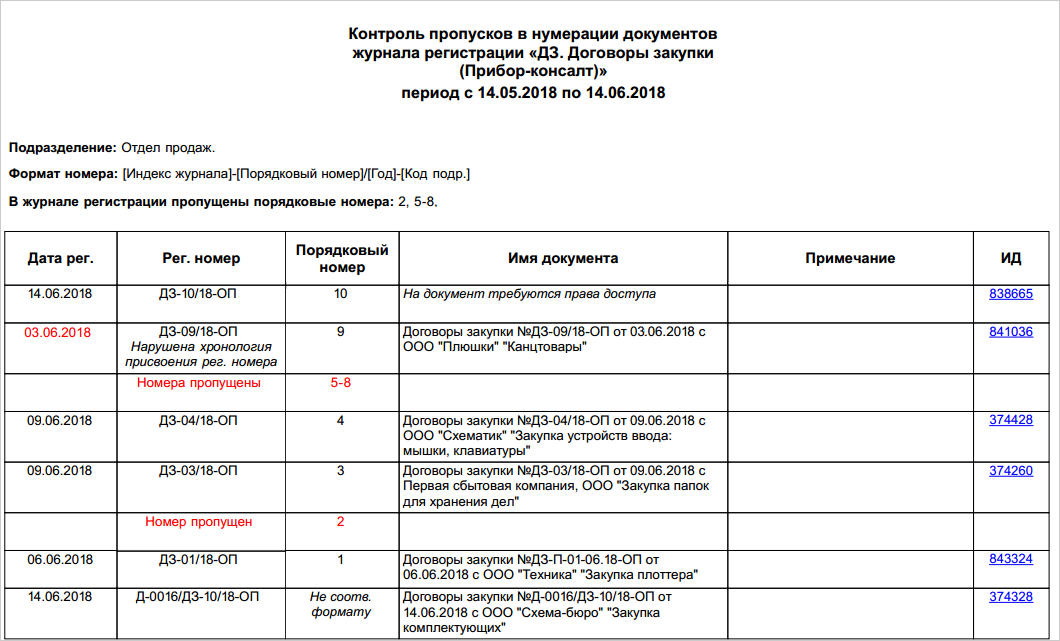В отчете отображается список зарегистрированных документов и пропущенных номеров в журнале регистрации. При этом если пропущено три и более номеров подряд, то в отчете они указываются в одной строке. Для каждого документа в отчете отображается: •дата регистрации. Примечание. Если дата регистрации документа меньше, чем дата регистрации документа с меньшим порядковым номером, то значение в колонке Дата рег. выделяется красным цветом. В колонке Рег. номер отображается значение «Нарушена хронология присвоения рег. номера». Например, если у документа с порядковым номером 9 дата регистрации меньше, чем у документа с порядковым номером 8. •регистрационный номер – номер, с которым зарегистрирован документ. Присваивается в соответствии с форматом номера журнала регистрации. Например, ДЗ-01/18-ОП. Примечание. Если регистрационный номер документа не соответствует формату номера журнала регистрации, то для него в колонке Порядковый номер отображается значение «Не соотв. формату». Например, если для договора номер задан в формате «номер инициатора договора»/«номер другой стороны». Подробнее см. рекомендацию «Присвоение регистрационного номера договору». •порядковый номер – номер документа в журнале регистрации. Например, у первого документа, который зарегистрирован в журнале, порядковый номер 1, у второго – 2 и т.д. Присваивается в пределах периода и разреза нумерации, которые указаны для журнала регистрации; •наименование документа и примечание из карточки документа, если оно заполнено; •идентификатор документа в системе. Чтобы быстро открыть документ, перейдите по ссылке в колонке ИД. Если у вас нет прав на просмотр документа, то его номер (регистрационный и порядковый), дата регистрации и ИД документа также отобразятся в отчете, но в колонке Имя документа будет указано «На документ требуются права доступа». |