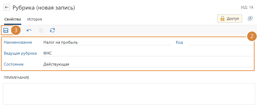 и в выпадающем списке выберите значение Рубрика. Заполните поля в карточке: