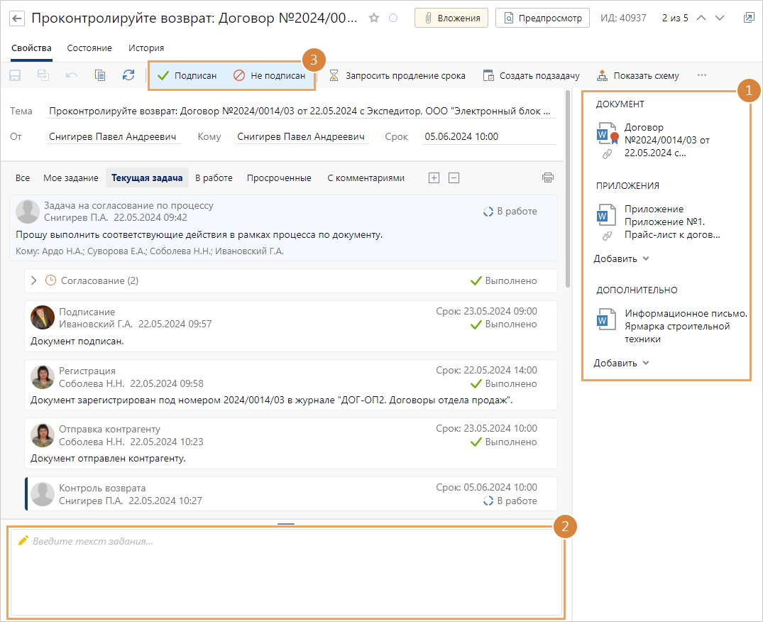 Когда контрагент подпишет документ, откажет в подписании или аннулирует его, задание на контроль возврата документа выполнится автоматически. Подробнее см. раздел «Контроль возврата документов от контрагента»;