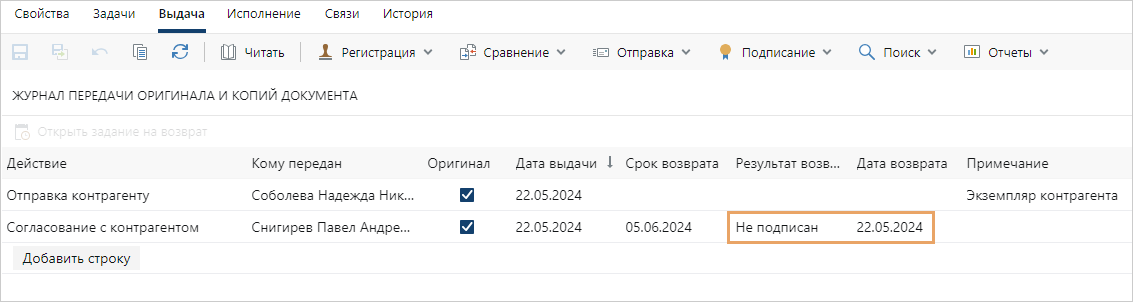 В журнале передачи оригиналов и копий документа в соответствующей строке поле Дата возврата заполнится текущей датой, а поле Результат возврата значением Подписан: |