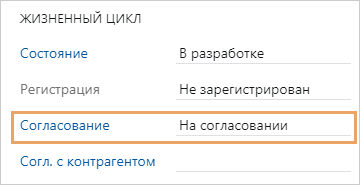 После отправки задачи на согласование последовательно создаются задания согласно выбранному процессу. В карточке документа в группе полей «Жизненный цикл» в поле Согласование установится значение На согласовании: