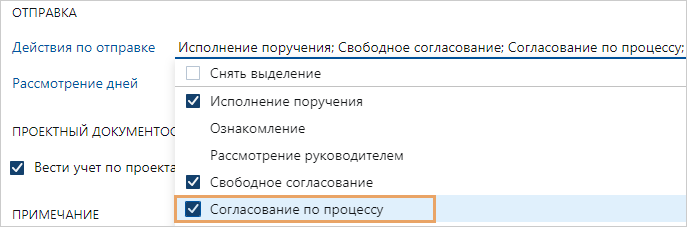 Совет. Если вы использовали Directum RX до версии 4.10, то при обновлении на новую версию администратору необходимо в настройках видов документов в выпадающем списке Действия по отправке выбрать пункт Согласование по процессу: