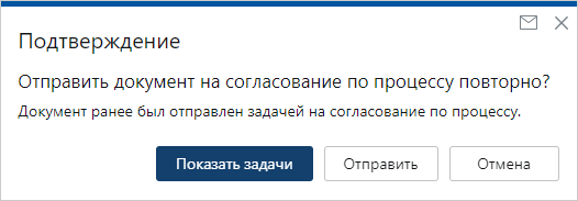 Нажмите на кнопку Показать задачи и ознакомьтесь со списком задач на согласование по процессу, в которые вложен документ. Если документ все же нужно отправить, нажмите на кнопку Отправить.