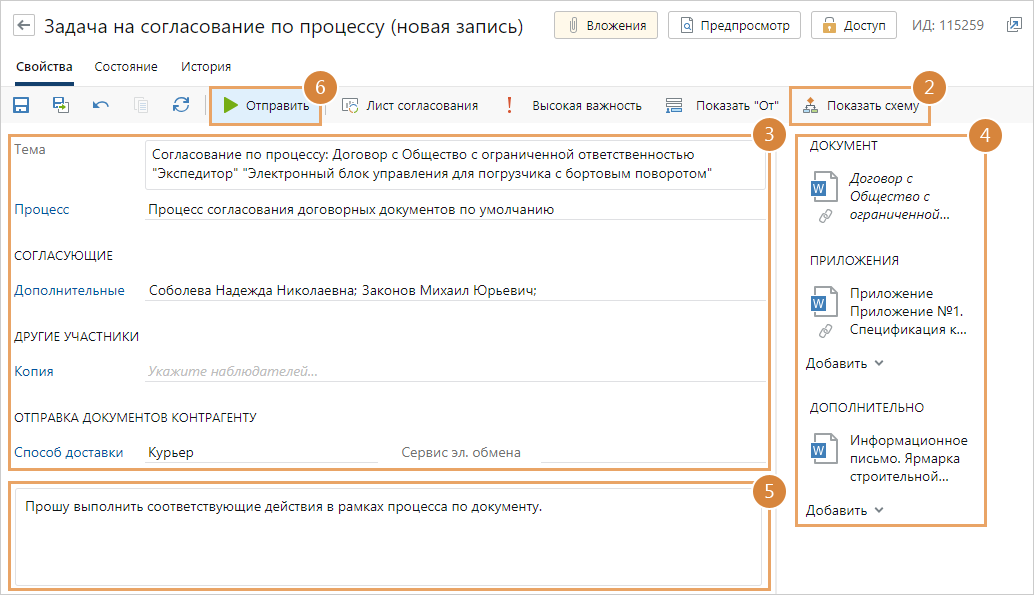 ВАЖНО. Задачу нельзя отправить, если у вас открыты на редактирование документы из групп вложений «Документ», «Приложения» или их карточки. Чтобы отправить задачу, сохраните и закройте их.