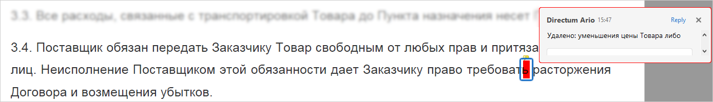•красным цветом отмечается удаленный текст. В примечании можно посмотреть, какой текст был удален: