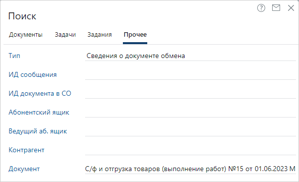 2.В поле Тип укажите наименование справочника Сведения о документе обмена и заполните остальные критерии поиска, по которым необходимо найти информацию о документе: