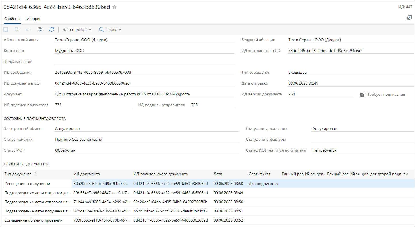 •Статус аннулирования. Состояние аннулирования документа в сервисе обмена. Возможные значения: Аннулирован, Получен запрос на аннулирование, Нет запросов;